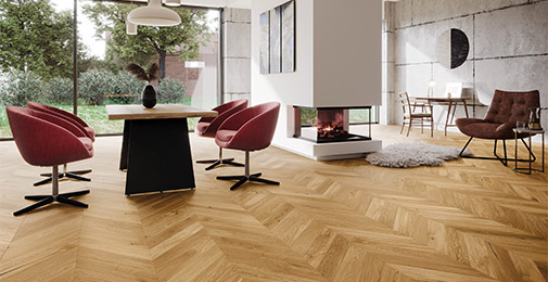 Parquet flooring OAK CROTONE, dimensions: 725x130x14 mm. Herringbone pattern parquet.